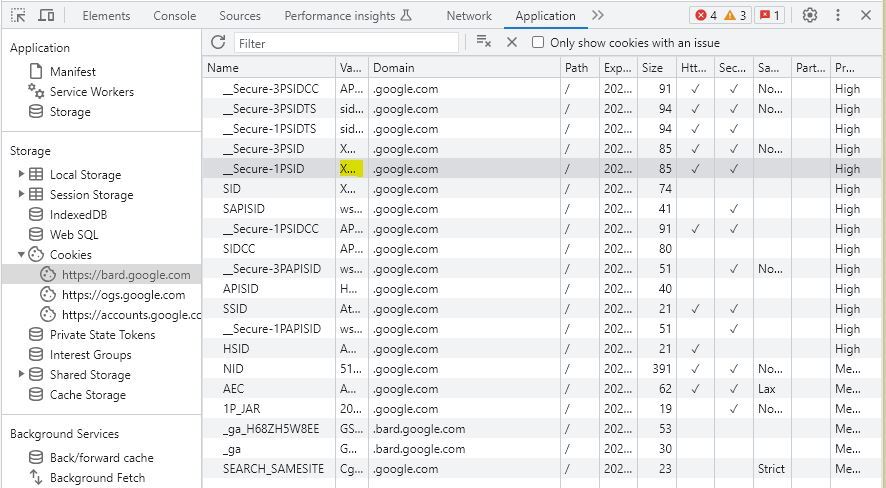 세션: 애플리케이션 → 쿠키 → __Secure-1PSID 쿠키 값을 복사합니다.